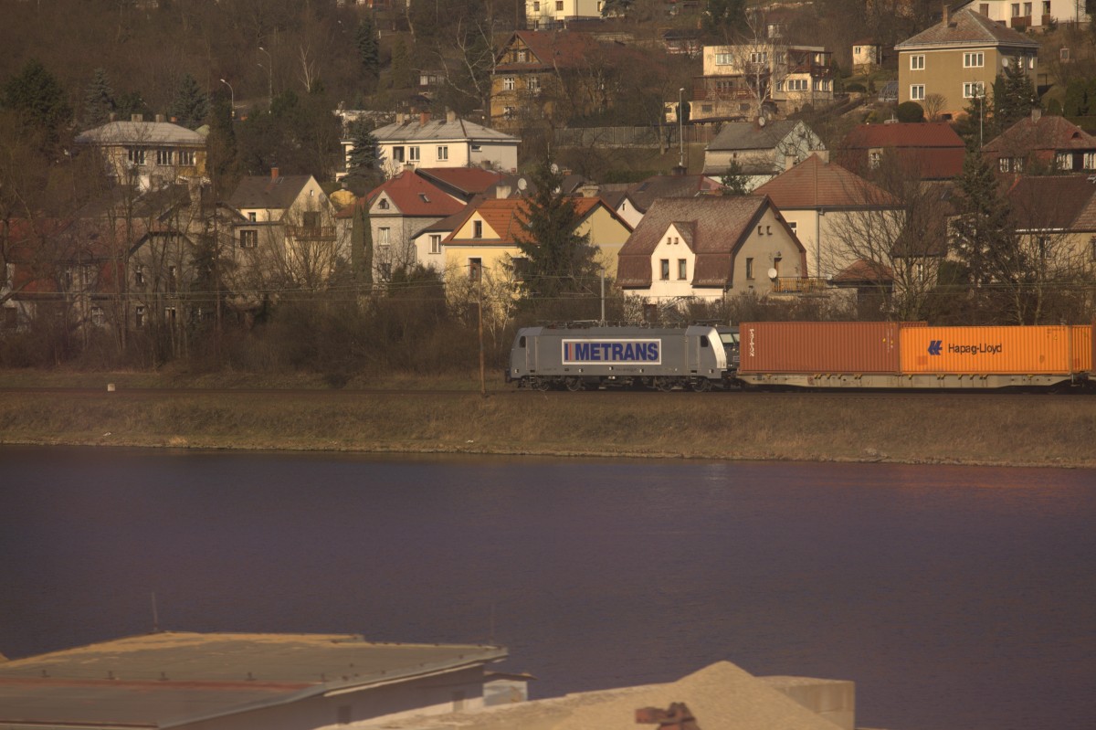 der einen von der andern Strecke aus. Ein auf allen Stationen haltender City Elefant mit einigermaßen saubern Scheiben ermöglichte ein mehrmaliges Ablichten eines parallel fahrenden Güterzuges zwischen Lovosice und Usti. 07.03.2014 14:46 Uhr.