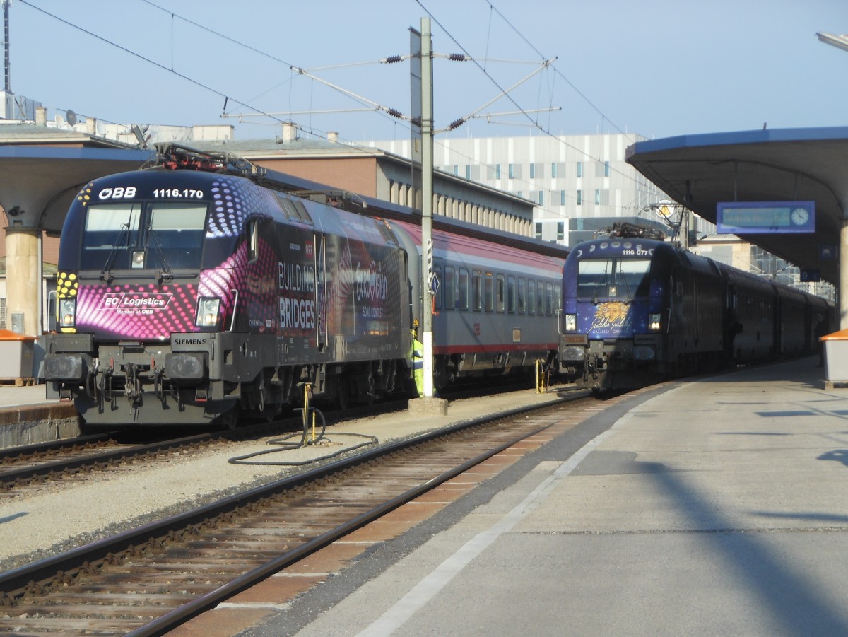 Gleich zwei ÖBB-Sonderloks warteten am 10.3.2015 auf dem Wiener Westbahnhof nebeneinander auf die Abfahrt Richtung Westen. Galileo-Michelangelo (rechts) hatte Salzburg im Visier, die ganz neue Song Contest - Lok fuhr mit einem überlangen Regionalexpreß nach Amstetten.