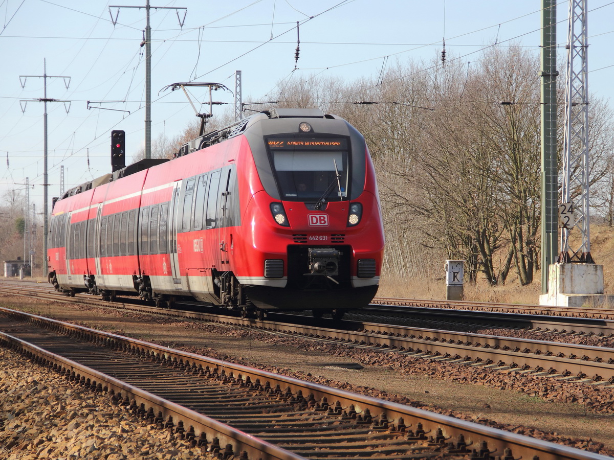 442 631 / 442 131 als RB 22 nun in Richtung Königs Wusterhausen über Berlin Schönefeld Flughafen am 08. März 2015 auf dem südlichen Berliner Außenring bei Diedersdorf in Brandenburg.