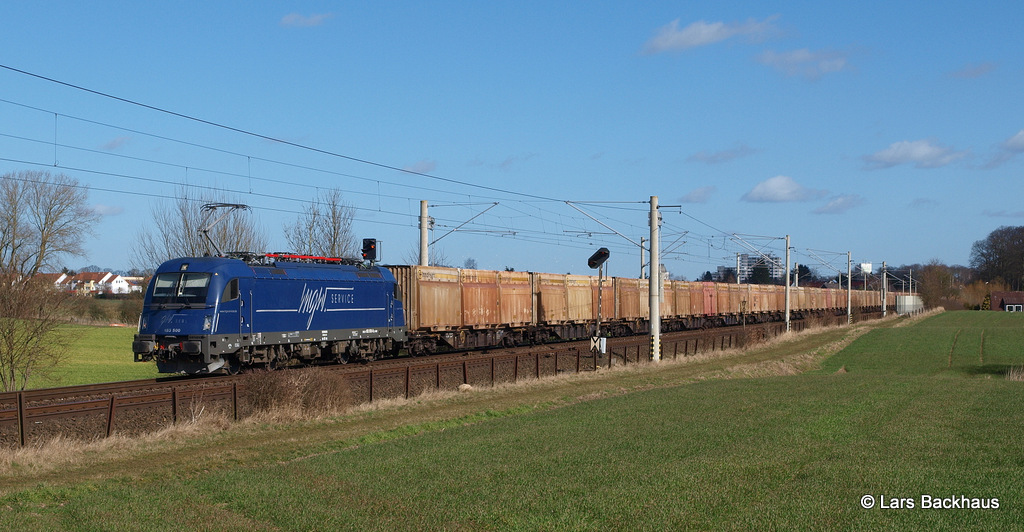 MGW 183 500 hat am 11.03.15 einen langen Hackschnitzelzug vom Lübecker Konstinkai am Haken und rollt nun durch Reinfeld Richtung Süden.
