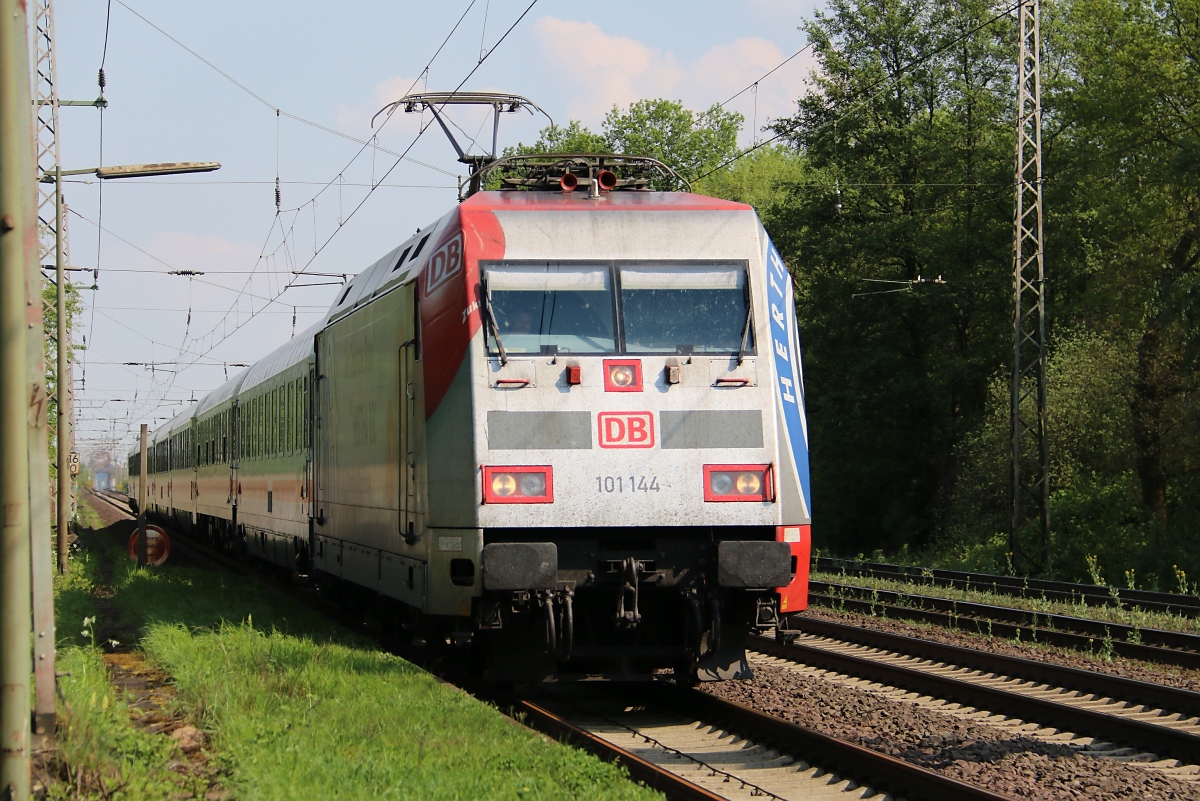 101 144 mit einem IC aus Hannover Hbf kommend. Aufgenommen am 29.04.2014 in Dedensen-Gümmer.