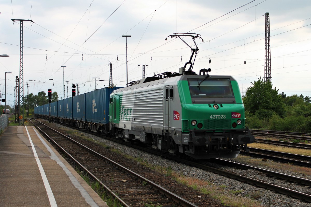 Einfahrt am 25.04.2014 von Akiem/ITL Fret"tchen" 437023 aus Richtung Neuenburg (Baden) mit dem DGS 40421 (Bantzenheim - Malaszewicze) in Müllheim (Baden) und fährt dierekt weiter auf die Hauptstrecke nach Freiburg.
