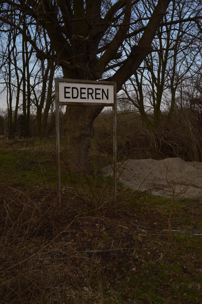 Relikt! Ederen verkündet das Bahnhofsschild....nur die Strecke Ex Kbs 245e ist schon lange stillgelegt. Einst führte sie von Jülich kommend über Kirchberg und Barmen nach Puffendorf auf knapp 15 Kilometern in die Rübensahra.....heute ist dort noch der Rest eines Haltestellenhauses und eines Bahnübergangs zufinden und die obligatorische Rübenverladerampe. Einige Gleise liegen auch noch zugewachsen im Boden..... Ederen Sonntag den 22.3.2015