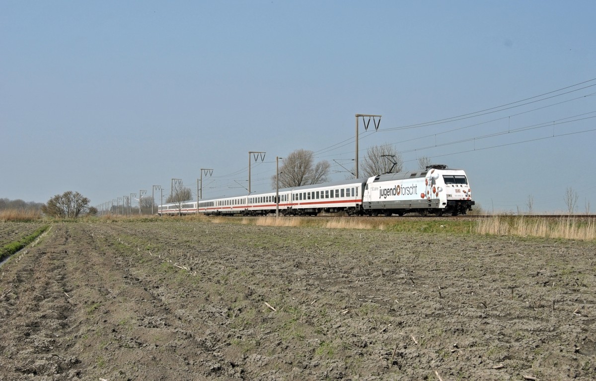 101 050-3 fuhr am 10.04.2015 mit einem IC von Norddeich Mole nach Köln, hier bei Gandersum.