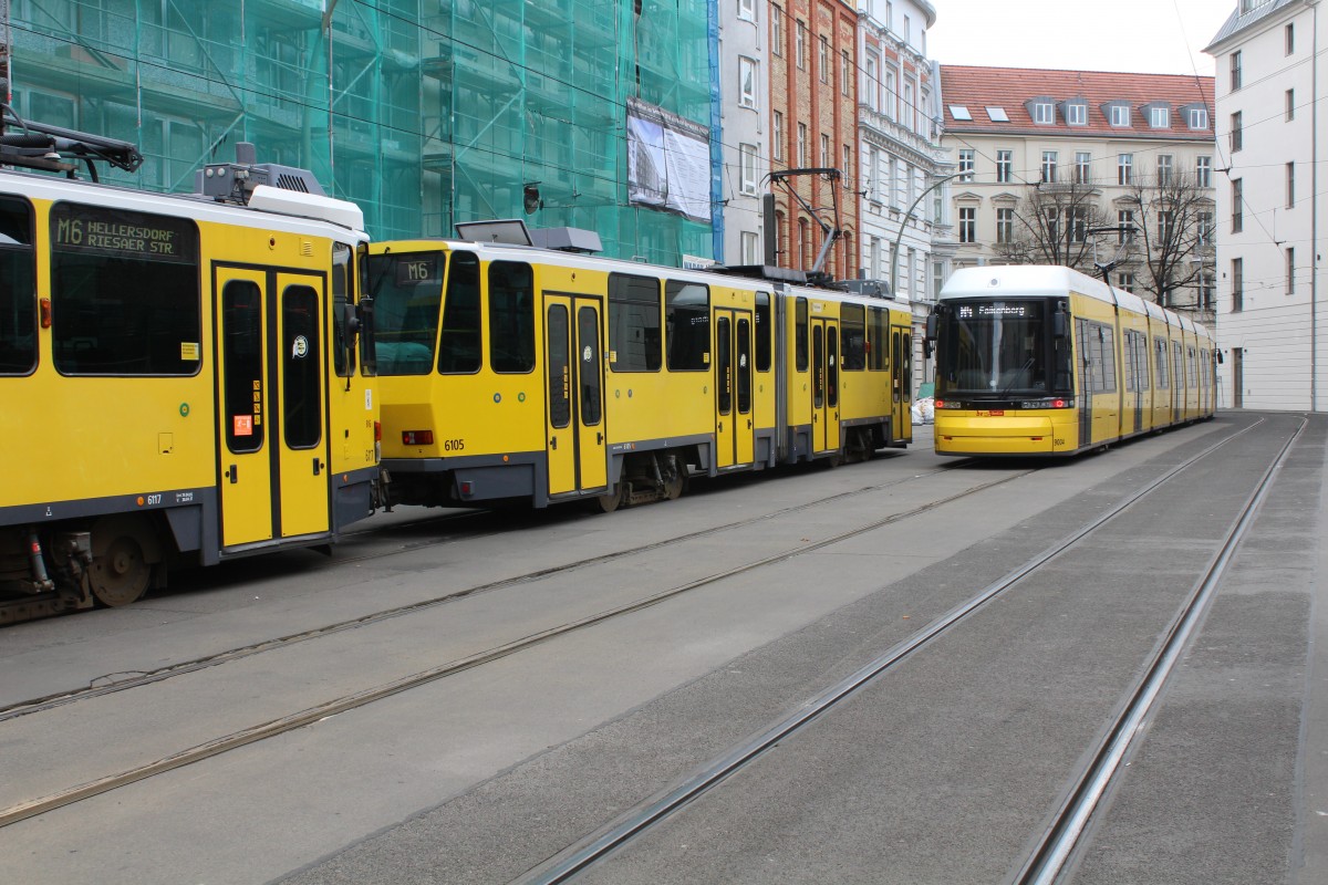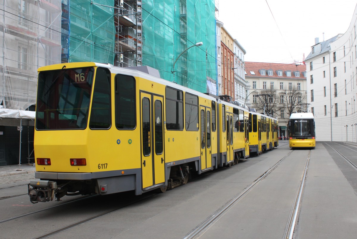 Berlin BVG SL M6 (KT4D 6117 + 6105) / SL M4 (Bombardier GT8-11ZRL 9004) Mitte, Grosse Präsidentenstrasse am 19. April 2015.