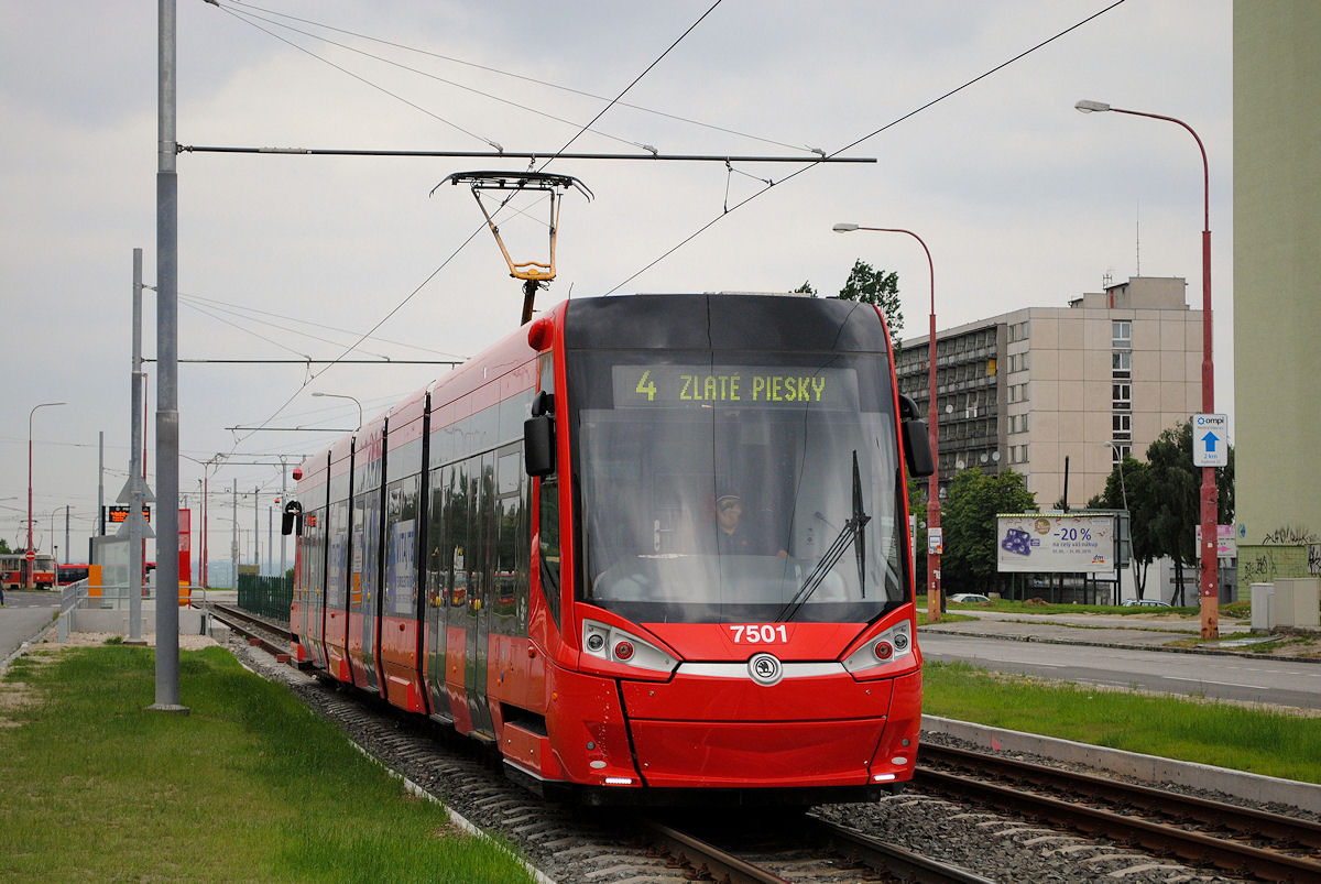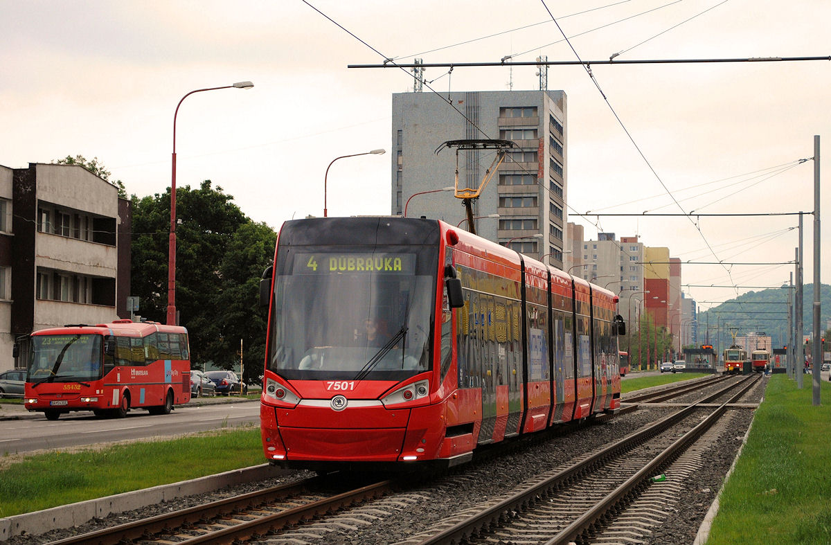 Der von Skoda neu gelieferte Tw.7501 vom Typ 30T (Zweirichtungsvariante) verläßt gerade die Endstelle Dubravka - Pri krizi. (25.05.2015 )