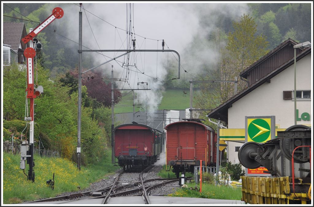 Das Signalbild für die gerade Fahrt aus Gleis 2 wurde korrigiert. Die 401 dampft mit ihrem Zug Richtung Kulminationspunkt der Strecke nach Bauma. (03.05.2015)