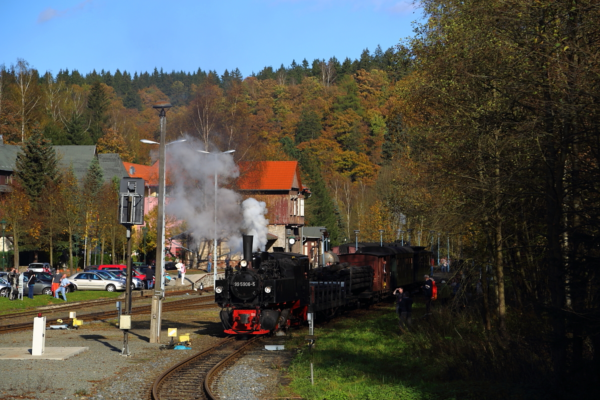 Nach erfolgter Doppelausfahrt mit Planzug P8965 schiebt 99 5906 am 19.10.2014 ihren IG HSB-Sonder-PmG wieder zurück in den Bahnhof Alexisbad.