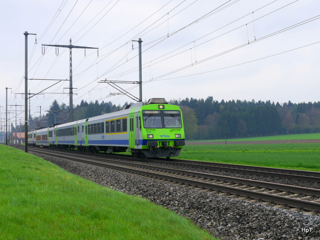 BLS - Pendelzug an der Front der Triebwagen RBDe 4/4 566 221-8 abgestellt in Lützelflüh am 18.04.2015 .. Standort des Fotografen auf einem Bahnübergang ..