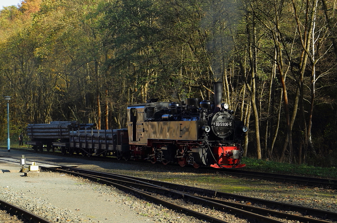 Im Rahmen der Zusammenstellung zweier Sonderzüge der IG HSB, rangiert hier 99 5906 am Nachmittag des 19.10.2014 im Bahnhof Alexisbad. Nachdem die beiden zu sehenden Wagen ein Stück vorgezogen wurden, wird 99 6001 mit den Personenwagen ihres Zuges von Gleis 1 auf Gleis 3 umsetzen, um die Personenwagen des anderen Zuges zu übernehmen. Danach geht es zurück auf Gleis 1, wo die zuvor hinterstellten Güterwagen wieder angekuppelt werden. Hierauf wird wiederum auf Gleis 3 umgesetzt, um mit dem Ankuppeln der zu sehenden Wagen den Gesamtzug zu vervollständigen. 99 5906 setzt sich dann als Vorspannlok vor die gesamte Fuhre.