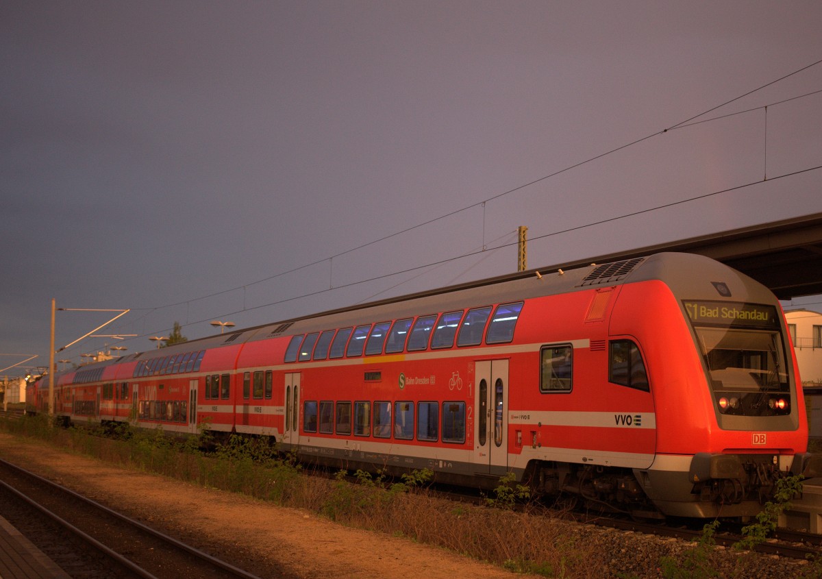 Nachgewitterstimmung, leider verblasste der Regenbogen zu schnell, ein Zug der Linie S1 bummelt der streikbedingten Sonderfahrplan in Radebeul Ost ab. 05.05.2015 20:26 Uhr.