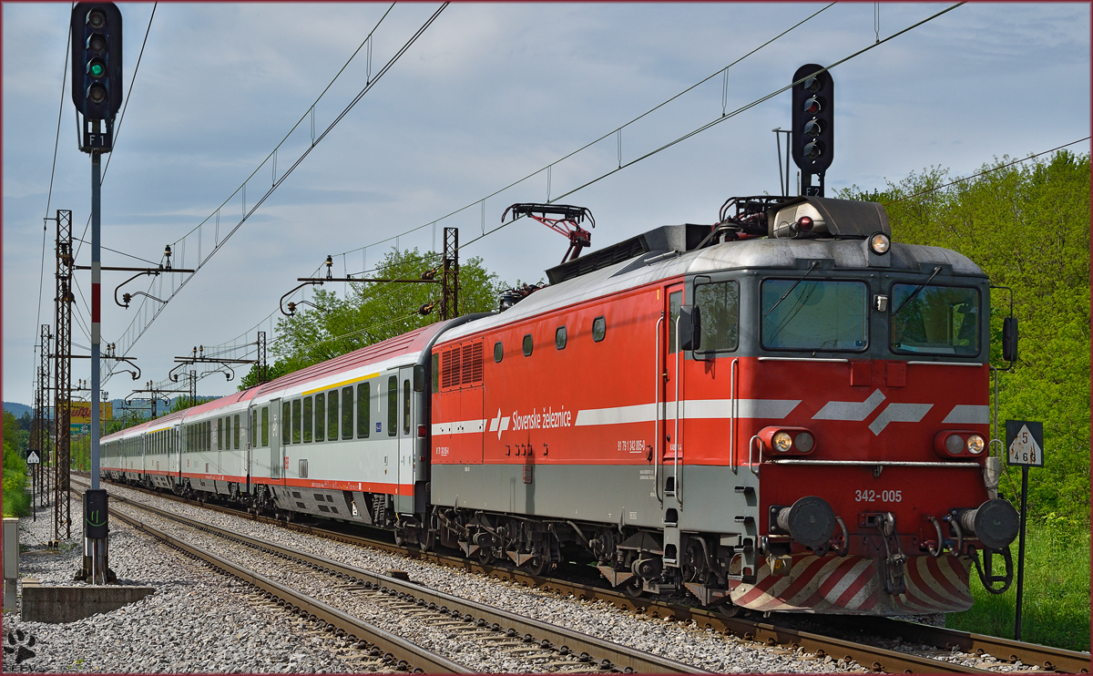 SŽ 342-005 zieht EC158 'Croatia' durch Maribor-Tabor Richtung Wien. /5.5.2015