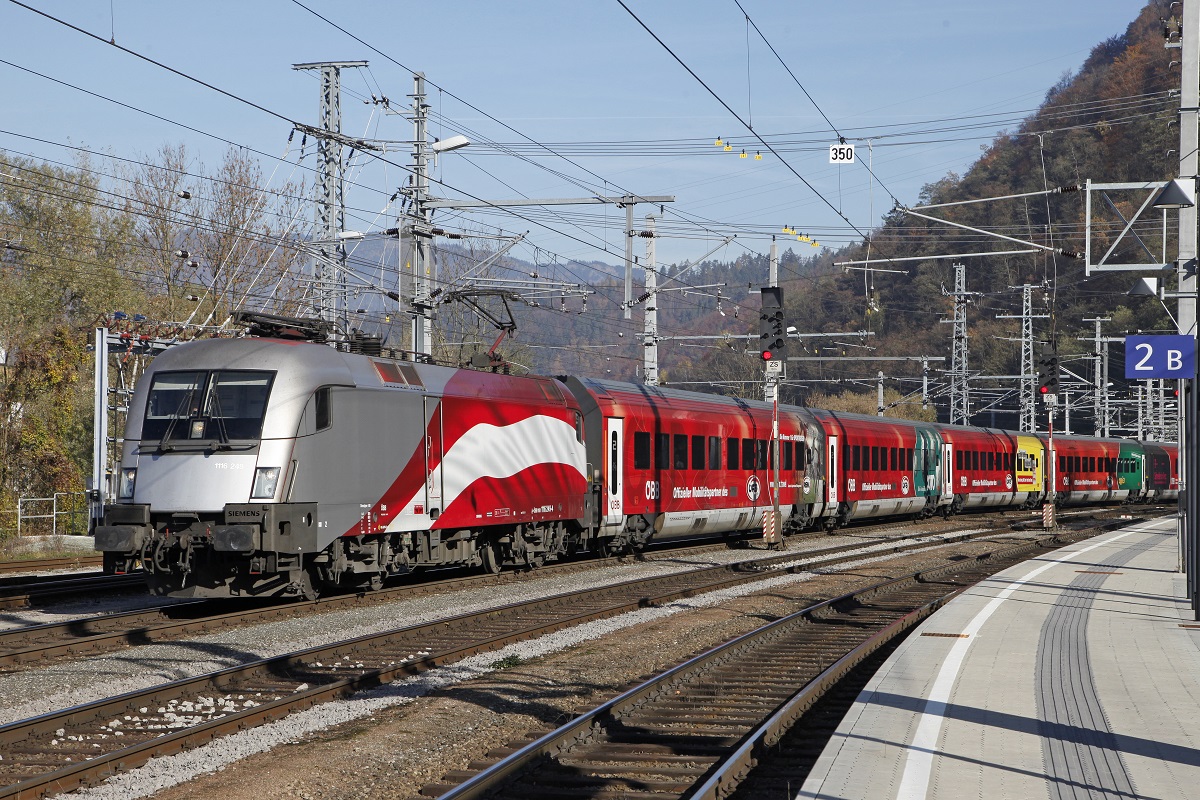 Am 3.11.2015 war in Österreich ein ganz bunter Railjet unterwegs. Die 1116 249 der "Langen Fahne" war mit dem Wagensatz des"The Red Bulletin Fashion" Train gekuppelt.Mit diesem Zug wurde an diesem Tag das Zugpaar 533/632 (Wien-Lienz-Wien) geführt, hier zu sehen bei der Einfahrt in Bruck an der Mur.