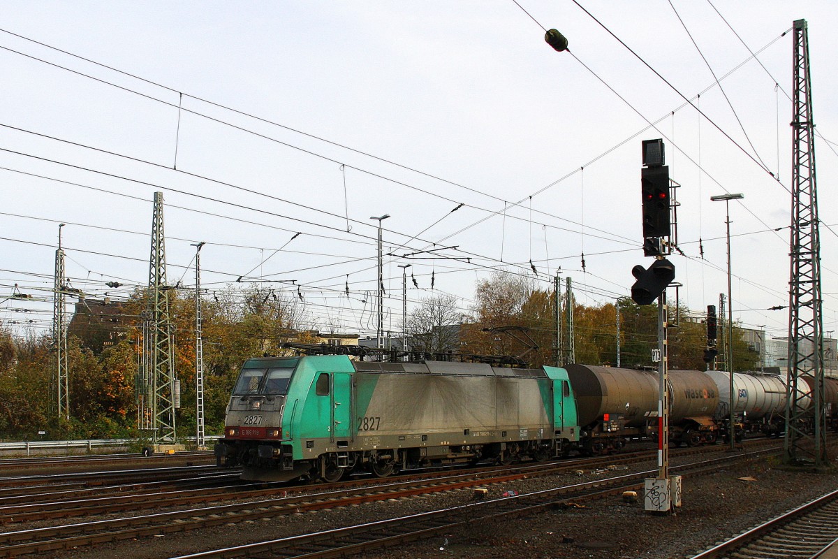 Die Cobra 2827 kommt aus Richtung Köln,Aachen-Hbf,Aachen-Schanz mit einem Kesselzug aus Ludwigshafen-BASF nach Antwerpen-BASF(B) und fährt in Aachen-West ein. Aufgenommen vom Bahnsteig in Aachen-West.