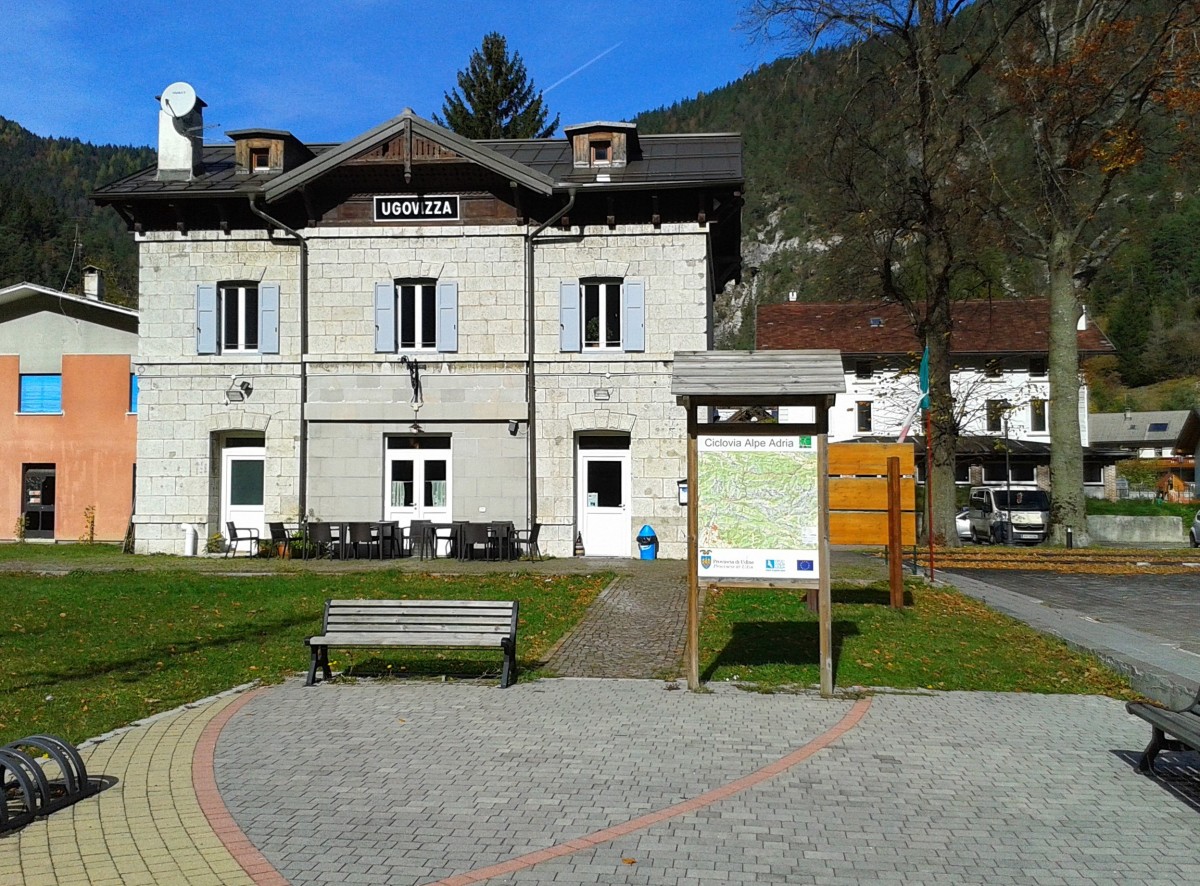 Blick auf das Bahnhofsgebäude des ehemaligen Bahnhofs Ugovizza an der alten Pontebbana. Aufgenommen am 25.10.2015