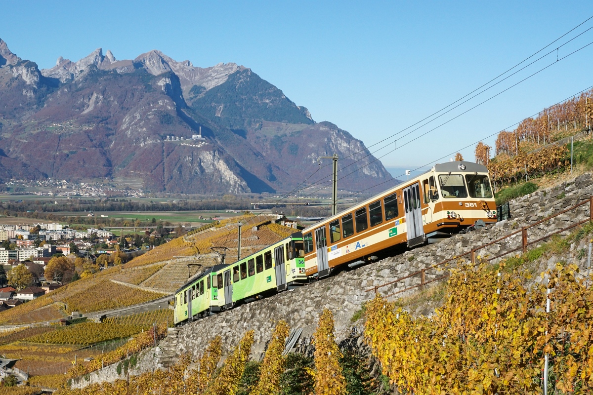 Ein AL-Zug, bestehend aus dem Bt 361, dem Bt 363 und dem BDeh 4/4 311 bezwingt am 07.11.2015 die ersten Meter der Steigung von Aigle Richtung Leysin.