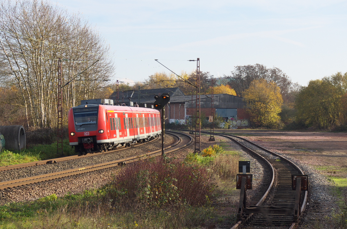Jedes Bild erzählt eine Geschichte, eine reicht hier nicht aus. 425 090 ist als RB Homburg Saar - Trier unterwegs. Hier in Bous hat sich Vieles verändert. Im Hintergrund ist die Halle des ehemaligen Brückenlagers Karthaus zu sehen. Hier gab es ein Außenlager. Auf dem freien Feld gab es noch mehrere Gleise, auch ein Durchgangsgleis in der Halle. Später wurde die Halle und das Vorfeld zur Zerlegung von ausgemusterten Loks der Baureihe E-94 benutzt. Das Abstellgleis im Vordergrund wird heute als Ausziehgleis von den Stahlwerken Bous (ex. Mannesmann Röhrenwerke) genutzt. Das Gleis war mal bis Ensdorf durchgehend. Bahnstrecke 3230 Saarbrücken - Karthaus am 12.11.2015