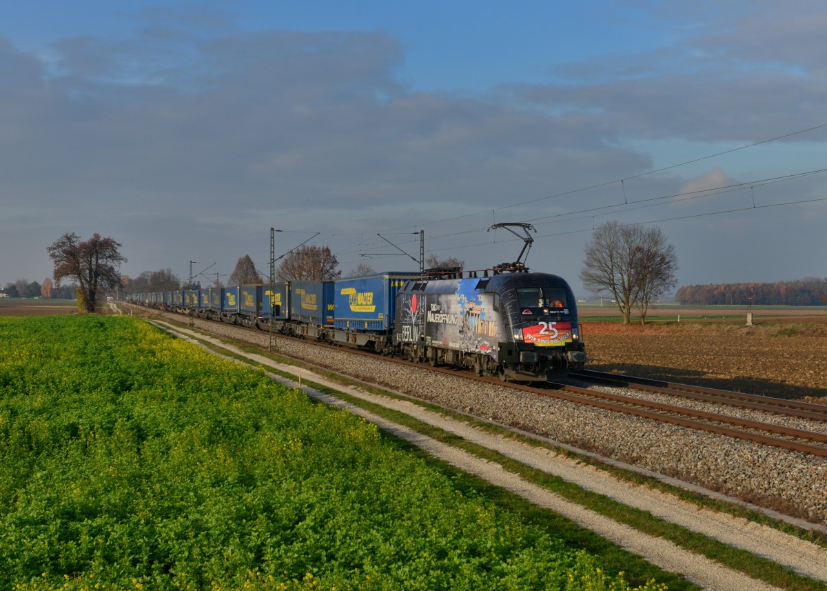 185 384 mit einem Containerzug am 12.11.2015 bei Langenisarhofen.