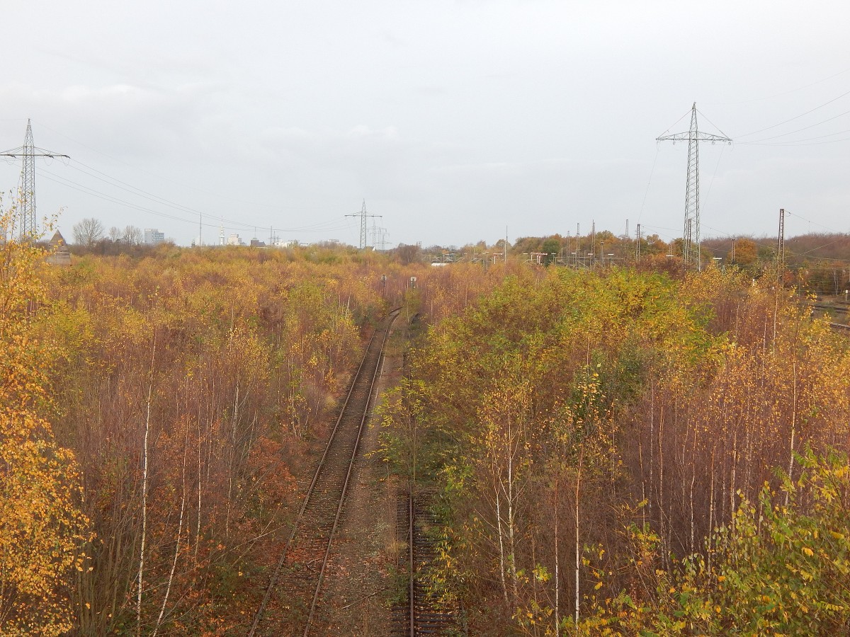Im bunten Herbstwald auf dem ehemaligen BW Wedau sind die Gleise noch relativ frei. Und doch ist es schon über 11 Jahre her das hier ein Zug rollte. Die Hochspannungsmasten im Hintergrund wurden vor kurzem neu erbaut.