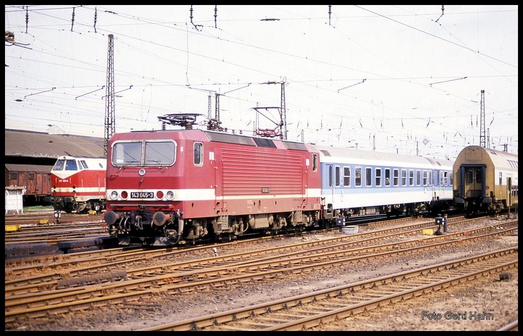 143045 fährt am 26.4.1992 mit einem Interregio in den HBF Leipzig ein.