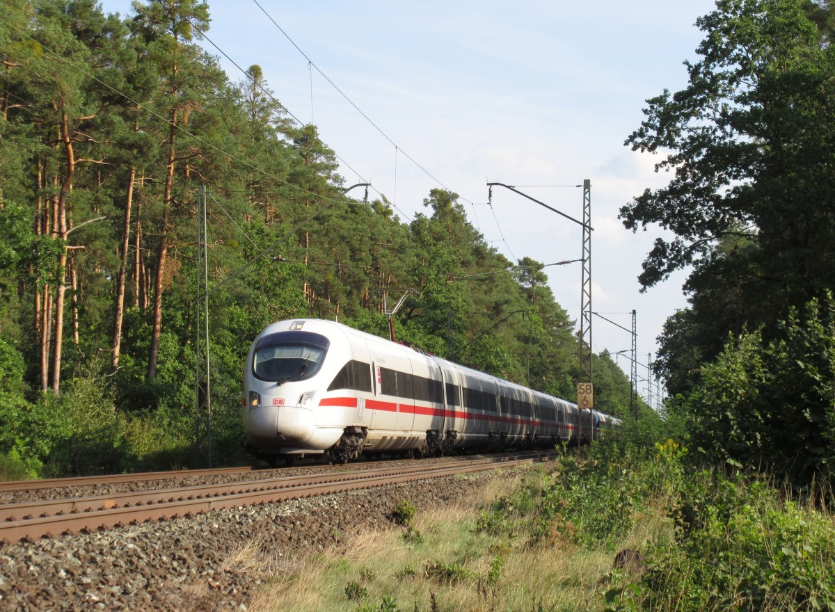 Ein ICE 1 durchfährt am 23.August 2015, als ICE 708 nach Hamburg-Altona, Gundelsdorf in Richtung Saalfeld.