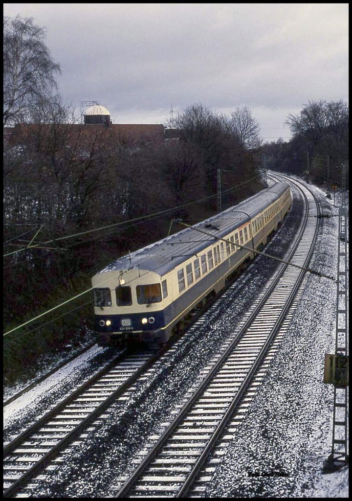 Im Jahr 1992 wurden einige Züge zwischen Osnabrück und Münster unter Fahrdraht durch Diesel VT der Baureihe 624 erbracht, da diese in Osnabrück stationiert waren. Hier ist hier am 14.3.1992 um 9.13 Uhr der 624609 als E 8610 nach Münster in Osnabrück - Hörne unterwegs.