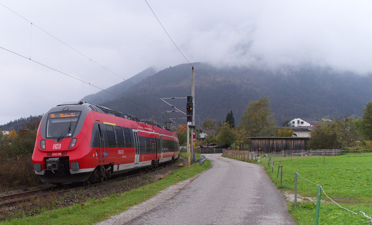 Noch knapp eineen Kilometer hat 2442 232 bis zum Bahnhof Garmisch-Partenkirchen zurückzulegen. Drei Kilomter verläuft die Außerfernbahn parallel zur Zugspitzbahn. Das Ziel des Hamsterbäckchens ist München Hbf. Bahnstrecke 5452 Garmisch-Partenkirchen - Griesen Grenze kurz nach dem Hp Hausberg am 08.10.2015