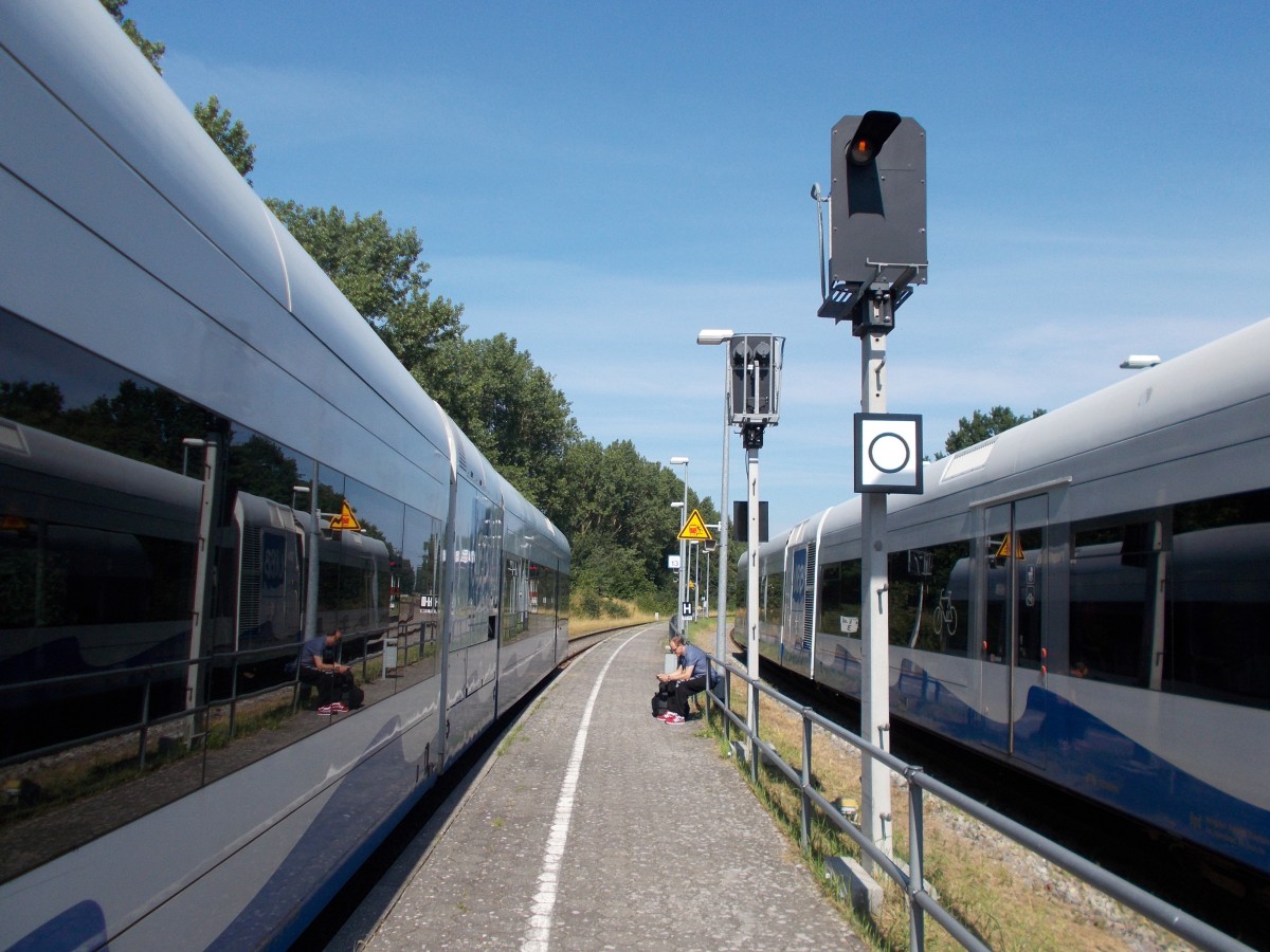 Mitten auf dem Bahnsteig steht der Vorsignalwiederholer in Bansin.Aufnahme am 02.August 2015.