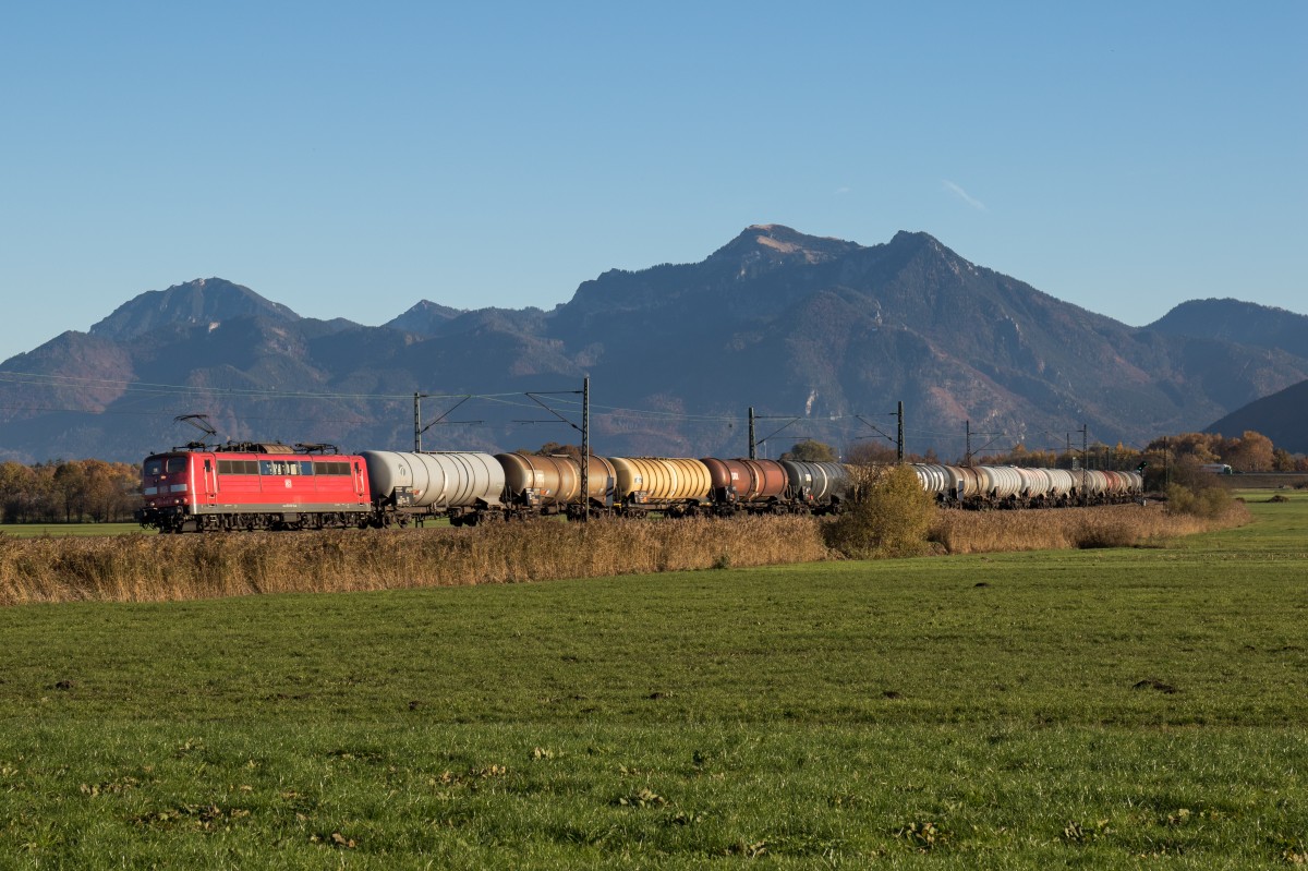 111 023 schiebt ihren Flüchtlingszug durchs Chiemgau - hier zu sehen kurz vor Übersee am 3. November 2015.