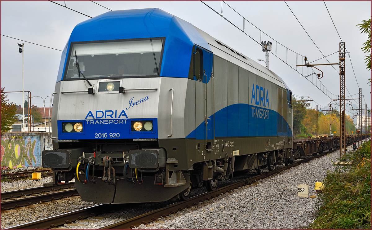 ADRIA 2016 920 'Irena' zieht leeren Containerzug durch Maribor-Tabor Richtung Koper Hafen. /27.10.2015