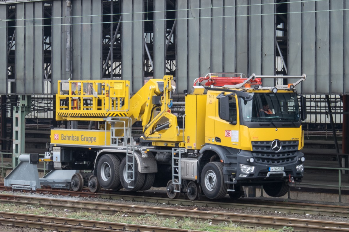 Der Arocs kommt insbesondere bei der Instandhaltung und Wartung der Oberleitung zum Einsatz. Dafür ist er neben dem hydrostatischen Schienenantrieb mit einer L-förmigen Hubarbeitsbühne ausgerüstet. Die L-Form ermöglicht es, um den Oberleitungsmast herum zu arbeiten. Darüber hinaus lässt sich die gesamte Hubvorrichtung mit dem dreiteiligen Teleskoparm sehr eng zusammenlegen und sicher auf dem Fahrgestell unterbringen. Zum Tausch von Fahrdraht kann das Fahrzeug eine Kabeltrommel aufnehmen. Die exakte Lage des verlegten Fahrdrahts lässt sich mittels hinter dem Fahrerhaus montierten Messpantographen prüfen. (Wanne-Eickel Hbf 28.10.2015)