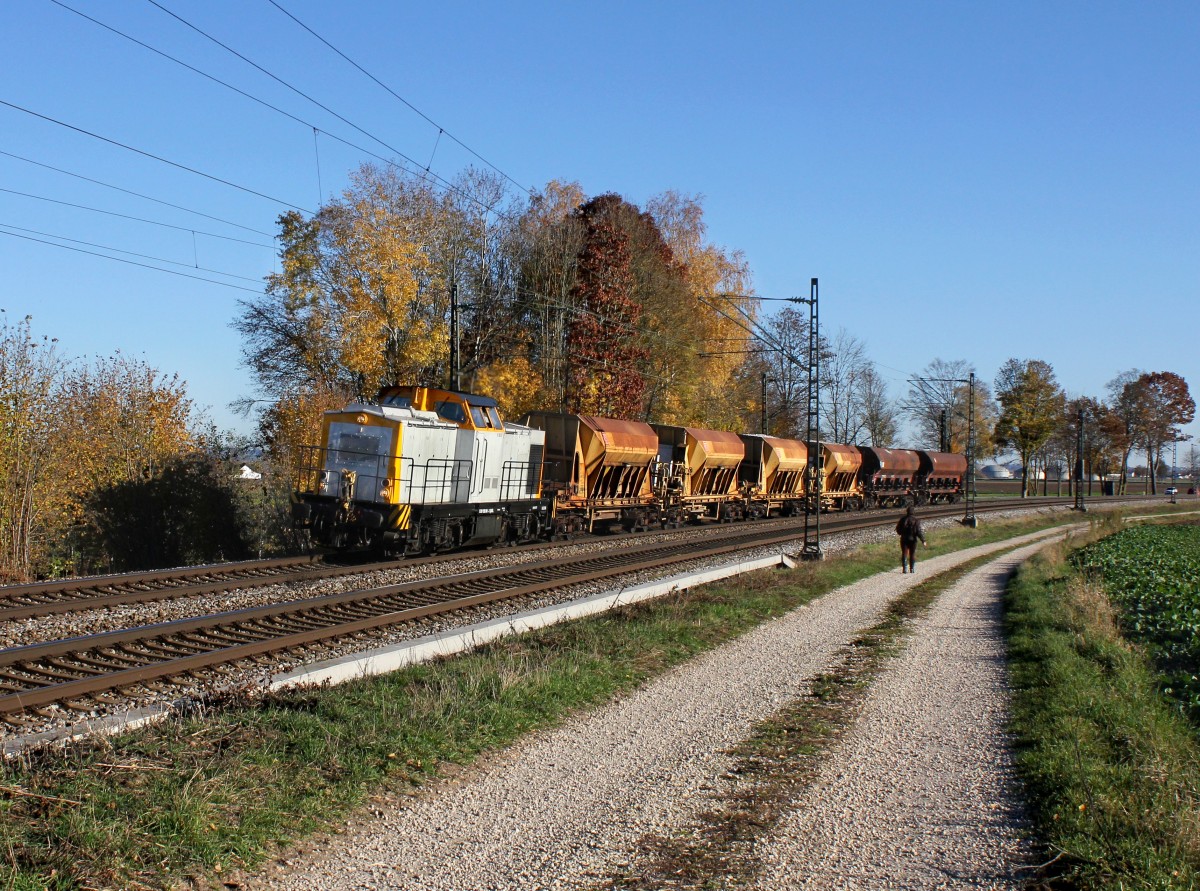 Die 203 001 mit einem Schotterzug am 01.11.2015 unterwegs bei Langenisarhofen.