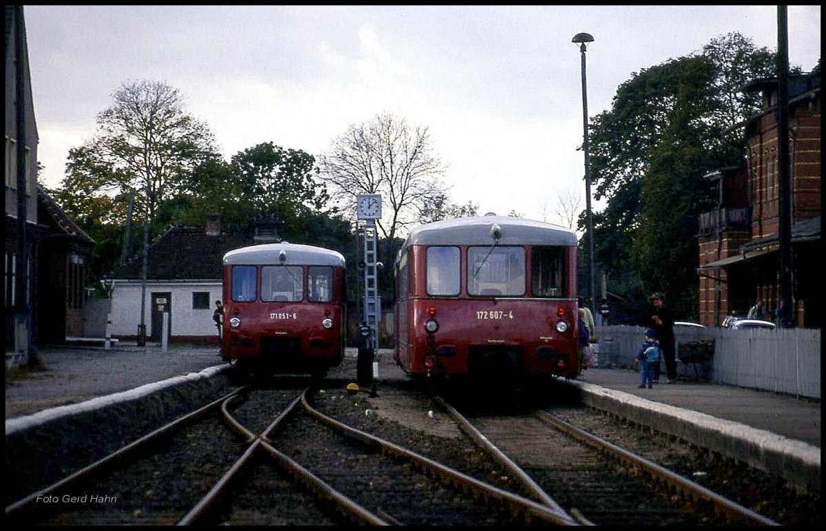 Bahnhof Güsen am 19.10.1991 um 12.08 Uhr: Links ist VT 171051 aus Jerichow angekommen. Rechts ist VT 172 607 aus Ziesar angekommen.