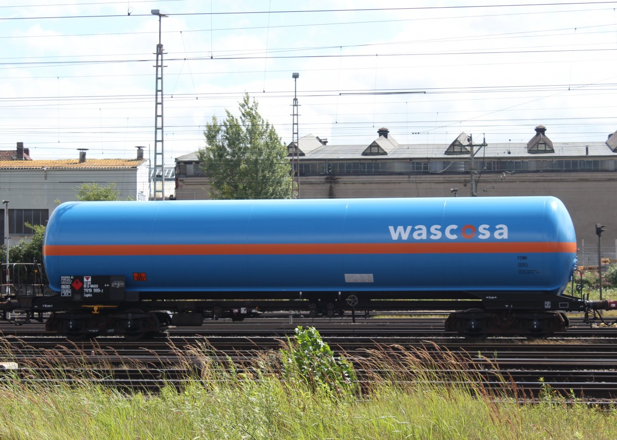 Druckgaskesselwagen Zagkks der Wascosa AG Nr.: 33 RIV 80 D-WASCO 7919 999-2, eingereiht in einem abgestellten Güterzug im Güterbahnhof Hannover-Linden am 25.07.2015.