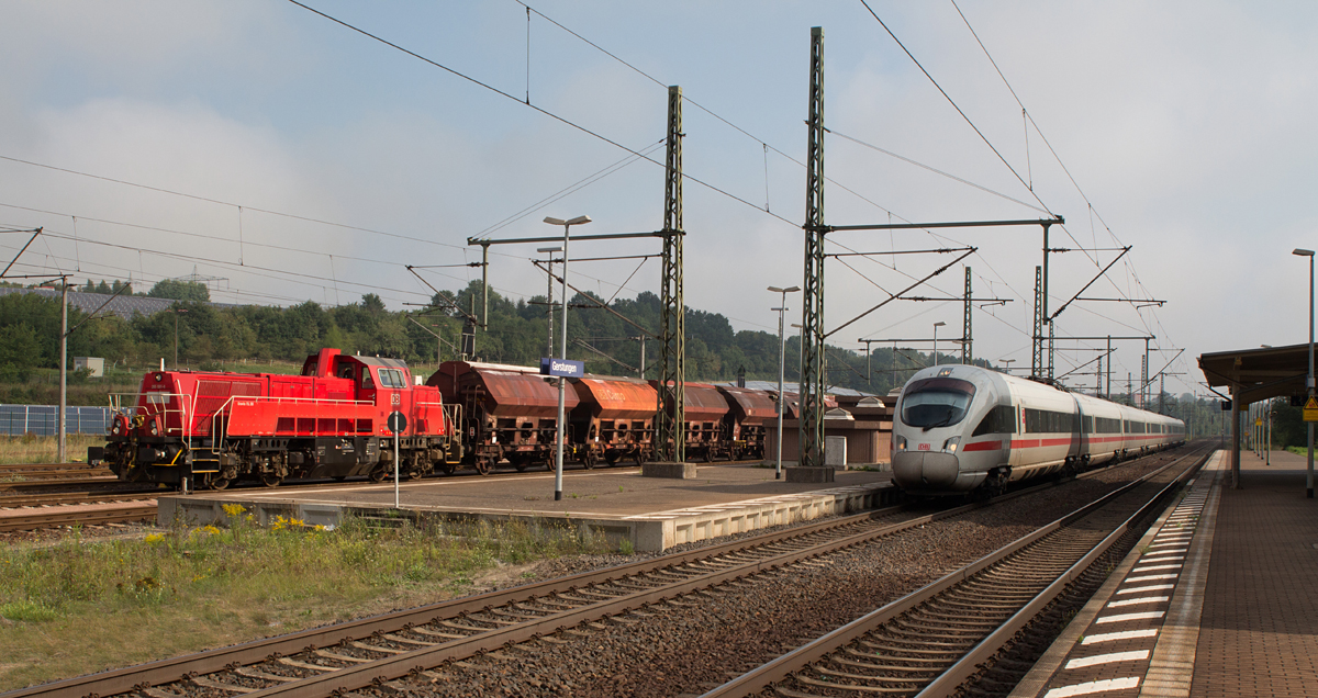 Im Bahnhof von Gerstungen steht 265 001-8 am Vormittag des 21.08.15 mit ihrem beladenen Kalizug abfahrbereit in Richtung Bebra, während ein ICE der BR 411 durchfährt.