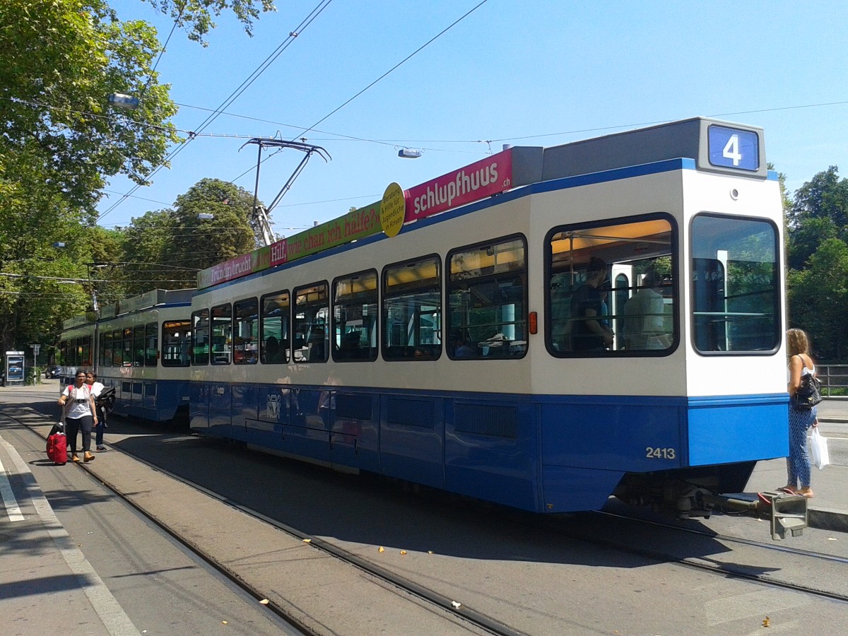 Be 4/6 Nr. 2413 + Be 4/6 Nr. 2085 als Linie 4 (Bahnhof Tiefenbrunnen - Bahnhof Altstetten Nord) beim Halt an der Haltestelle Sihlquai/HB. (24.7.2015)