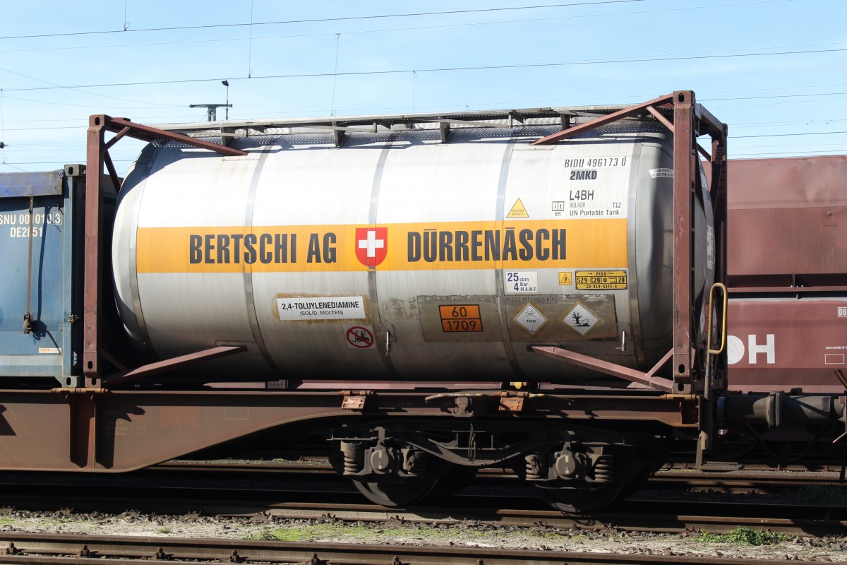 Detailaufnahme von einem Containertragwagen Sgns mit einem aufgesetzten Tankcontainer der schweizer Bertschi AG. Das Ladegut 2,4-Toluylendiamin(Warntafel 60/1709) ist ein wichtiges Zwischenprodukt zur Herstellung von Kunst- und Farbstoffen. Der Wagen war am 18.10.2014 in einen abgestellen Chemikalienzug im Güterbahnhof Köln-Eifeltor eingereiht.
