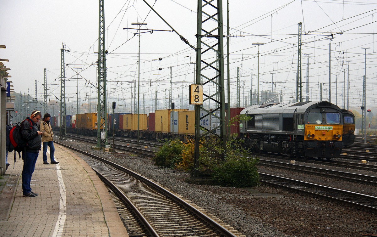 Die Class 66 266 035-5 von Railtraxx steht mit Motor aus in Aachen-West mit einem Containerzug und wartet auf die Abfahrt nach Belgien.