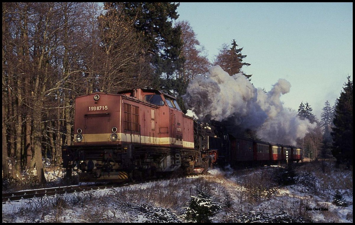 Diesel Vorspann und mächtig Dampf hatte der Personenzug 14441 aus Wernigerode auf der Fahrt in den Harz zu bieten. 199871 und 997245 hatten am 10.12.1991 um 11.37 Uhr damit kurz vor Drei Annen Hohne wenig Mühe.