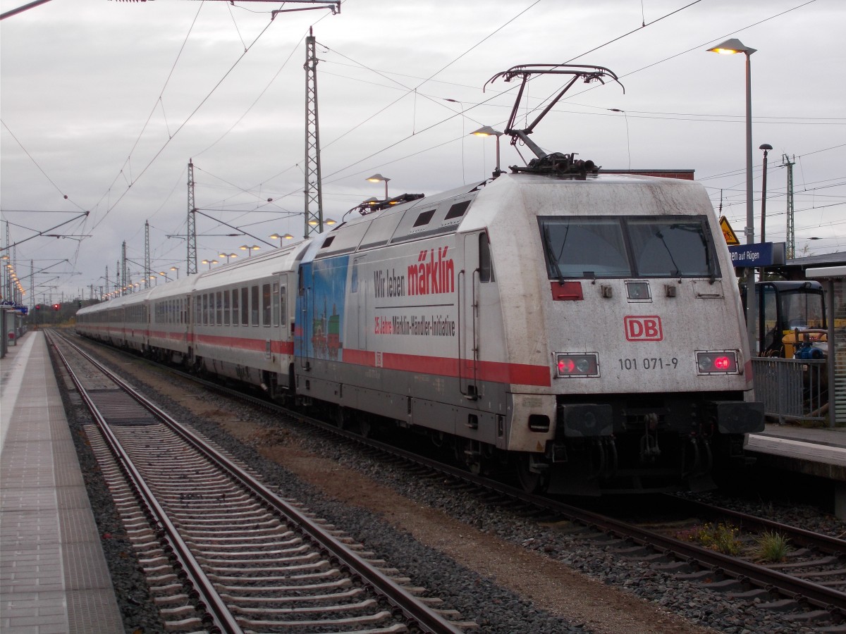 IC 2356 Binz-Frankfurt/Main Flughafen hatte,am 20.Oktober 2015,die Märklin 101 071 als Schublok.Hier in Bergen/Rügen.