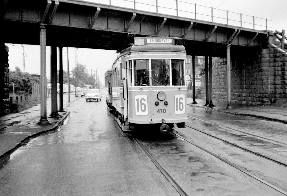 København / Kopenhagen KS: Sonderfahrt / Fotofahrt mit dem Tw 470 und dem Bw 1054 als SL 16. - Der Zug hält in der Vesterbrogade am "Frihedsstøtten" (: am Freiheitsmomument), das rechts außerhalb des Bildes steht. Dieses Monument wurde im Jahre 1791 zur Erinnerung der Aufhebung der Erbuntertänigkeit (1788) errichtet. - Rechts hinter dem Beiwagen lag damals das DSB-Reisebüro "Astoria" (diesen Serviceteil der DSB gibt es nicht mehr!). - Im Hintergrund links sieht man einen Teil des Kopenhagener Hauptbahnhofs, das von Heinrich Wenck, dem Chefarchitekten der Staatsbahnen, am Anfang des 20. Jahrhunderts entworfen wurde. Der Bahnhof wurde am 1. Dezember 1911 geöffnet. - Auf dem Bürgersteig sieht man zwei verschiedene Wägelchen, vom linken verkaufte man "smørrebrød", dh. belegtes Schwarzbrot, vom rechten Eis. - Eine dritte Art Wägelchen gab es in viel größeren Mengen, nämlich die Wurstwagen (man kann noch Wurstwagen finden, aber nicht mehr so viele!). - Scan von einem S/W-Negativ. Film: Ilford FP3. Kamera: Konica EE-matic.