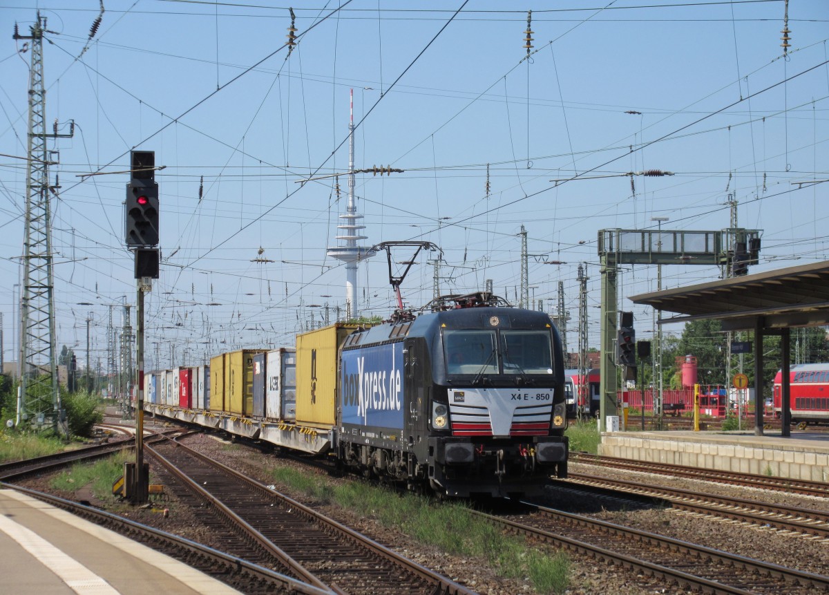 X4 E-850 von MRCE/BoxXpress zieht am 03.August 2015 einen Containerzug durch den Bremer Hauptbahnhof.