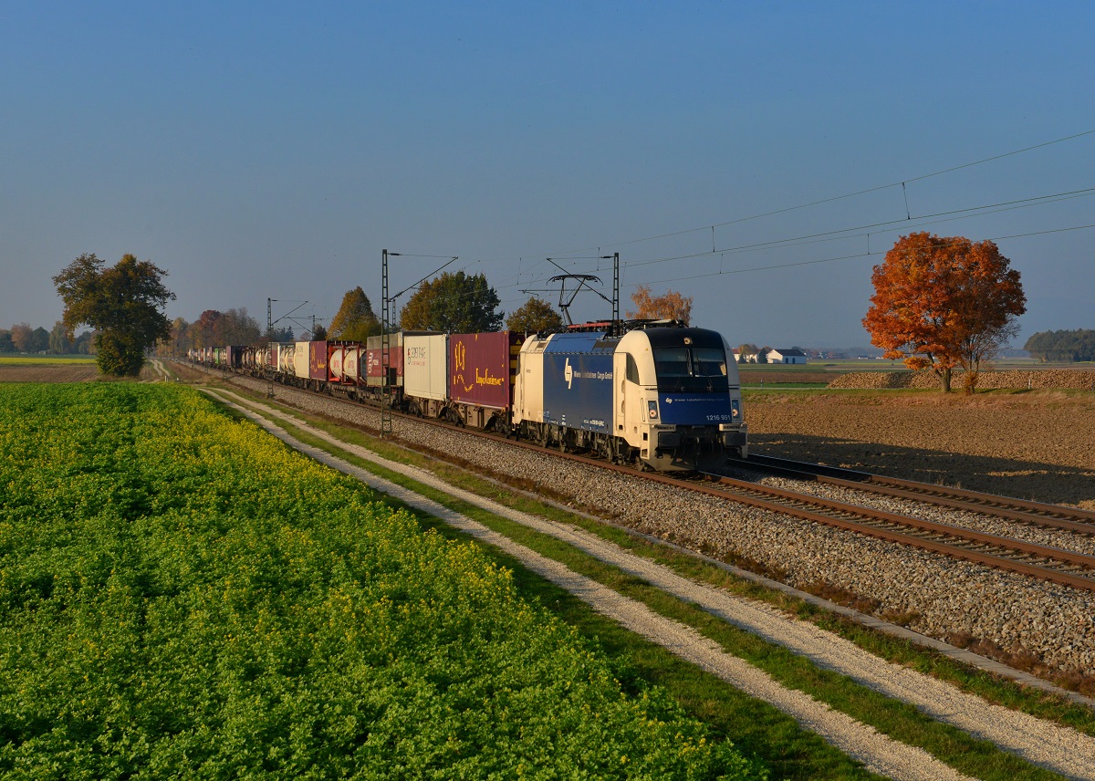 1216 951 mit einem KLV am 27.10.2015 bei Langenisarhofen.