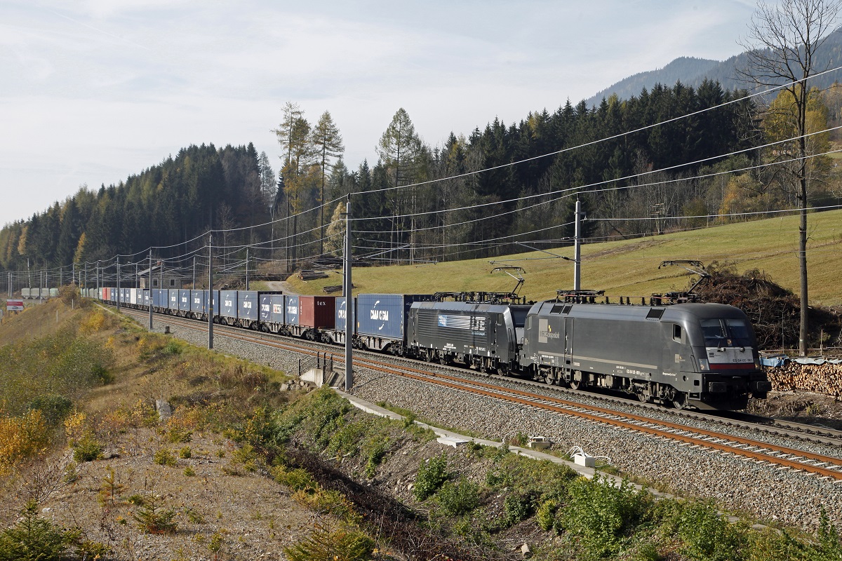 182 510 und 189 930 mit einem KLV am 24. Oktober 2015 bei Hilperting.