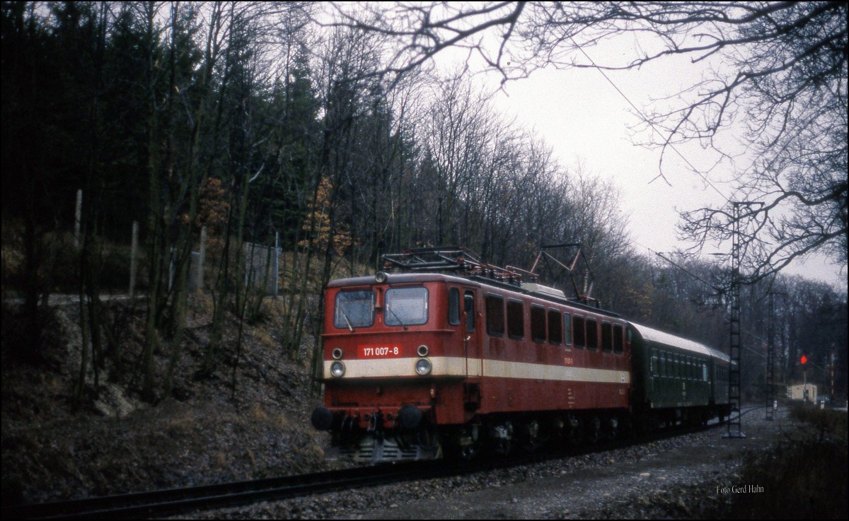 171007 am 21.3.1992 um 15.25 Uhr mit dem ? 16485 nach Blankenburg bei Hüttenrode auf der Rübelandbahn.