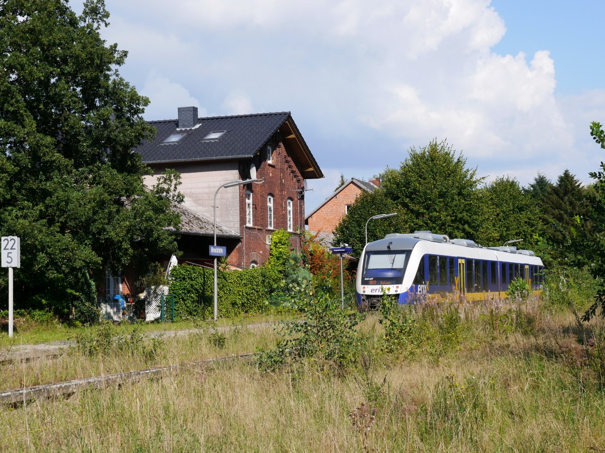 Der ehemalige Bahnhof, jetzt Hp, Brockhöfe an der Strecke Uelzen- Soltau; es hält gerade 648 487 (Alstom LINT 41) als erixx Der Heidesprinter; 10.09.2015