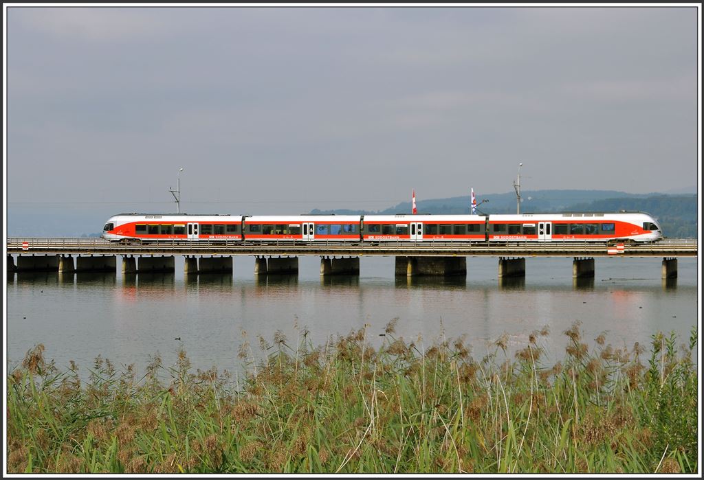 Voralpenexpress 2570 mit einem SOB 446 TW an der Spitze auf dem Damm bei Rapperswil. (10.09.2015)