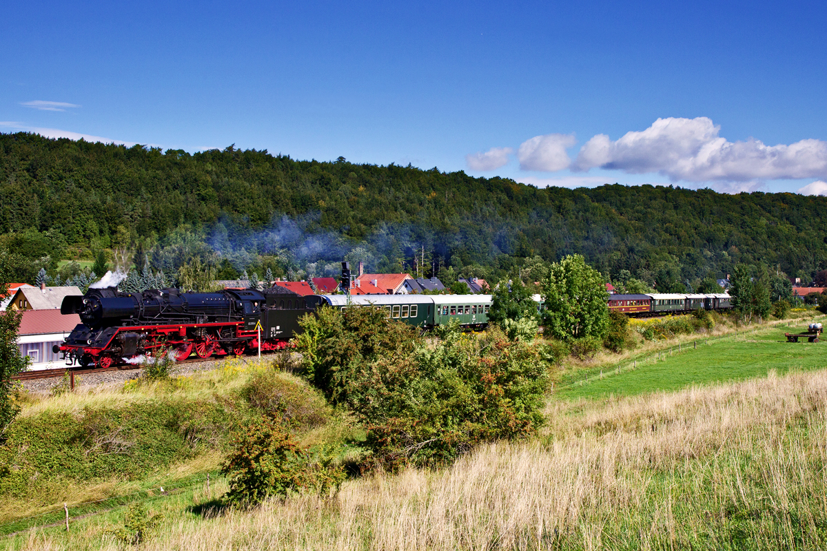 03 2153 fährt zusammen mit der Diesellok 119 158-4 an die XXI. Meiniger Dampfloktage.Bild in Gräfenroda den 5.9.2015