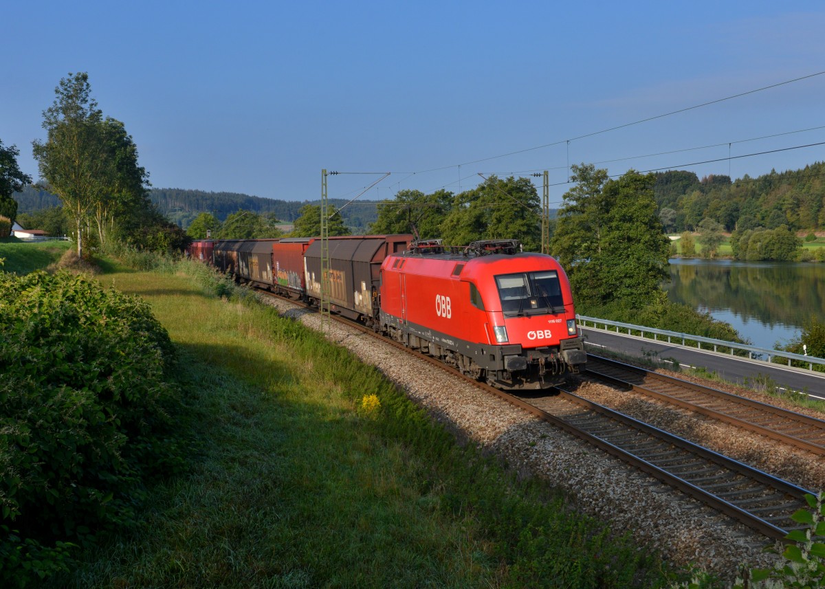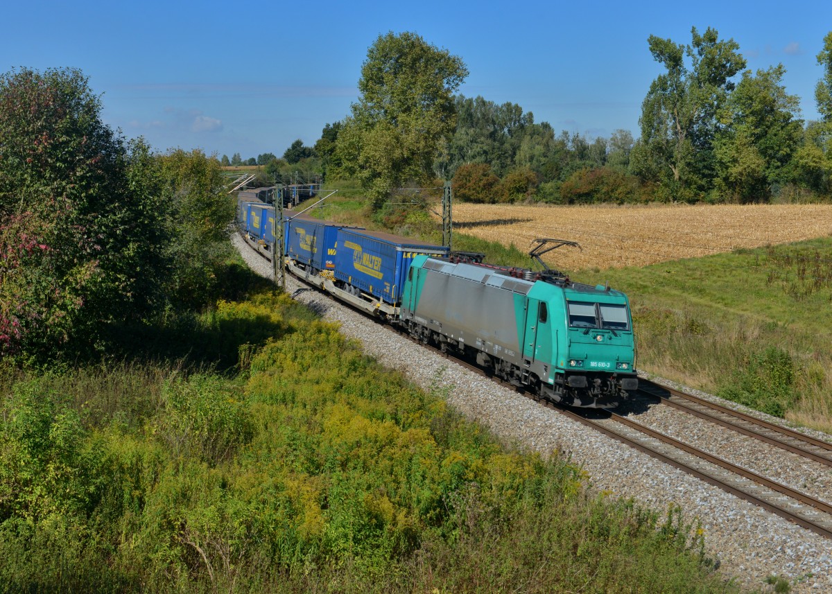 Die 185 339 mit einem KLV-Zug am 19.09.2015 unterwegs bei Langenisarhofen.