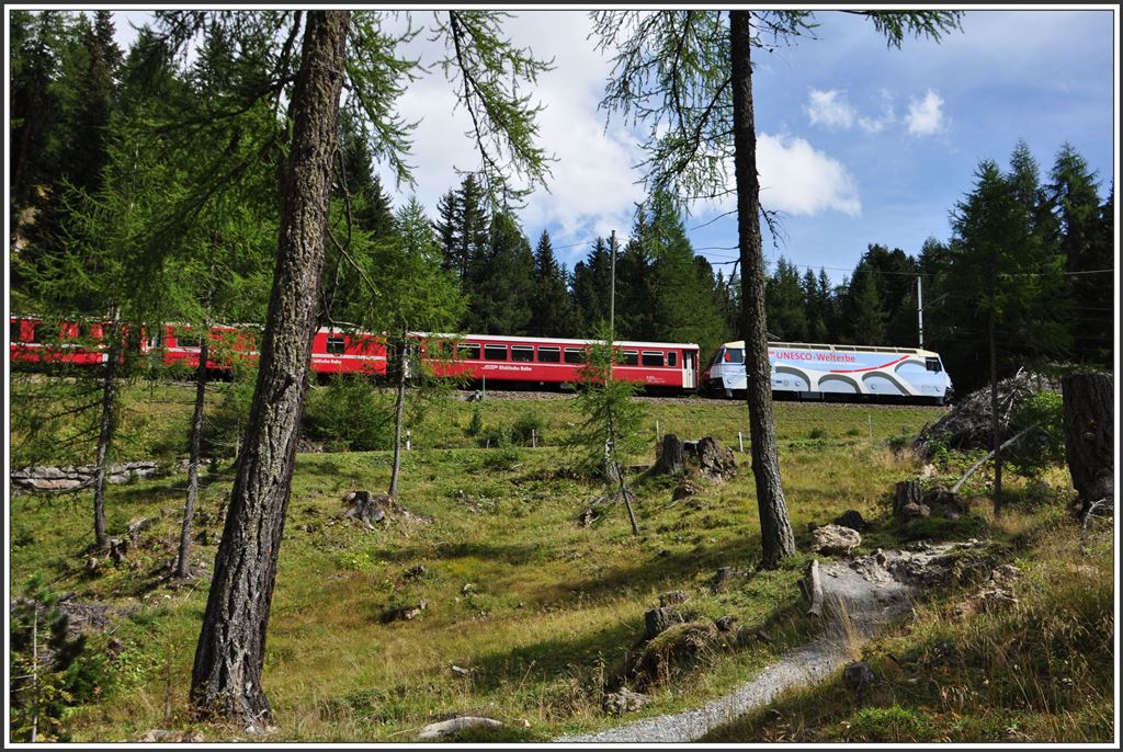 RE1141 nach St.Moritz mit Ge 4/4 III 650 "Seewis-Valzeina" dreimal aufgenommen vom gleichen Standpunkt. Hier befindet sich der Zug oberhalb des Zuondra-Kehrtunnels. (15.09.2015)